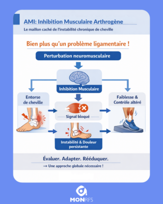 L’AMI (inhibition musculaire arthrogène) est un réflexe protecteur du système nerveux qui empêche la contraction volontaire d’un muscle après un traumatisme articulaire. À la cheville, elle touche principalement le soléaire et les muscles fibulaires, compromettant la stabilité dynamique même après guérison des ligaments. (Kim et al., 2024).