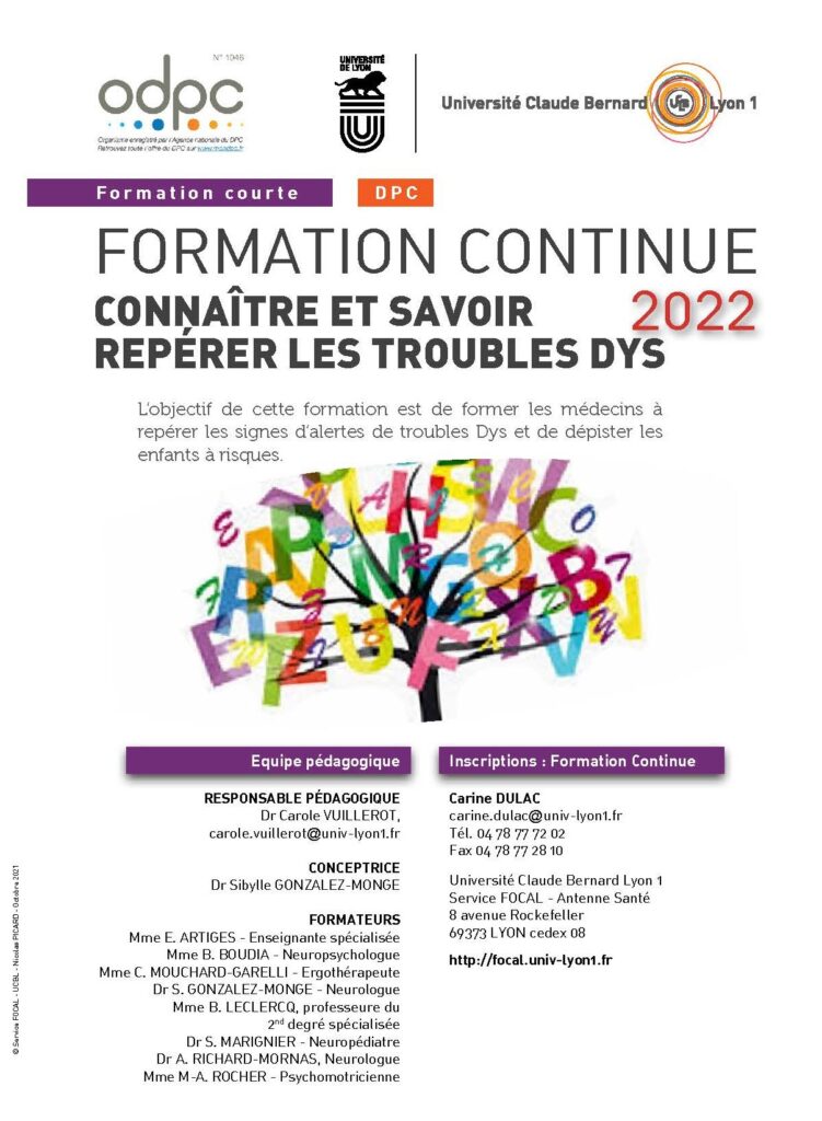 Durant 2 journées, une équipe pluridisciplinaire spécialisée dans les troubles spécifiques des apprentissages de type « Dys » propose une formation dans ce domaine permettant aux médecins de prendre leur place dans le parcours de soins et de s’équiper d’outils de repérage, de dépistage et de diagnostic de premier niveau. Après un rappel théorique sur ces troubles, sur ce parcours de soins et sur les différents professionnels impliqués, des situations cliniques seront analysées.