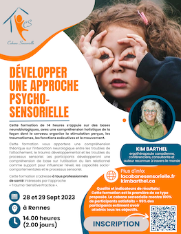 La formation de Kim Barthel permettra aux participants de développer leurs connaissances neurobiologiques, de contribuer à l’approche holistic de la personne, de soutenir l’alliance thérapeutique et enfin de développer une approche psycho-sensorielle pour mieux répondre aux besoins de la personne et soutenir son implication dans la thérapie engagée.